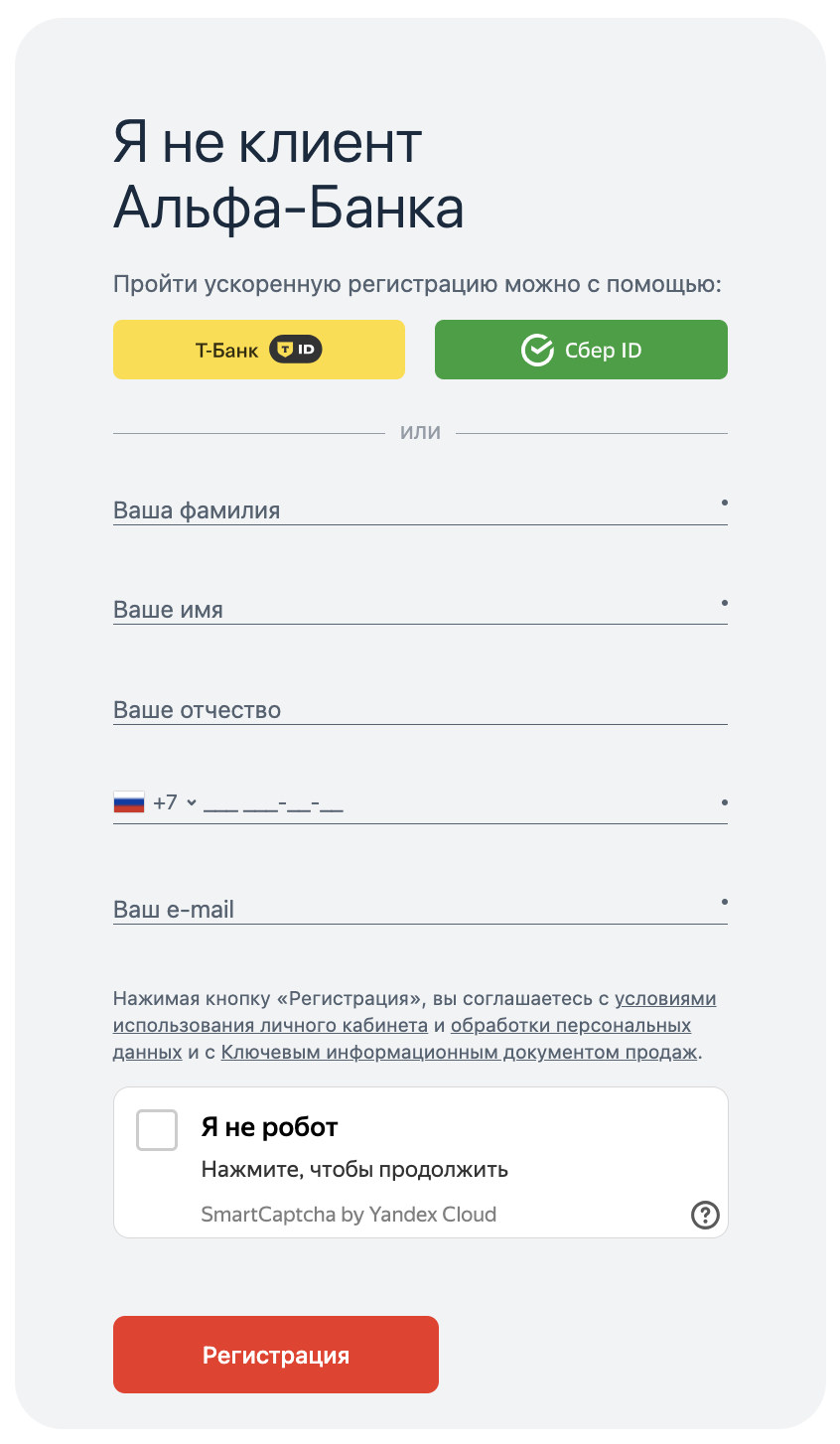Заполнить форму, на которую вас перевел сайт: ввести ваши ФИО, мобильный телефон и Email или пройти ускоренную регистрацию через Т-Банк ID или Сбер ID.